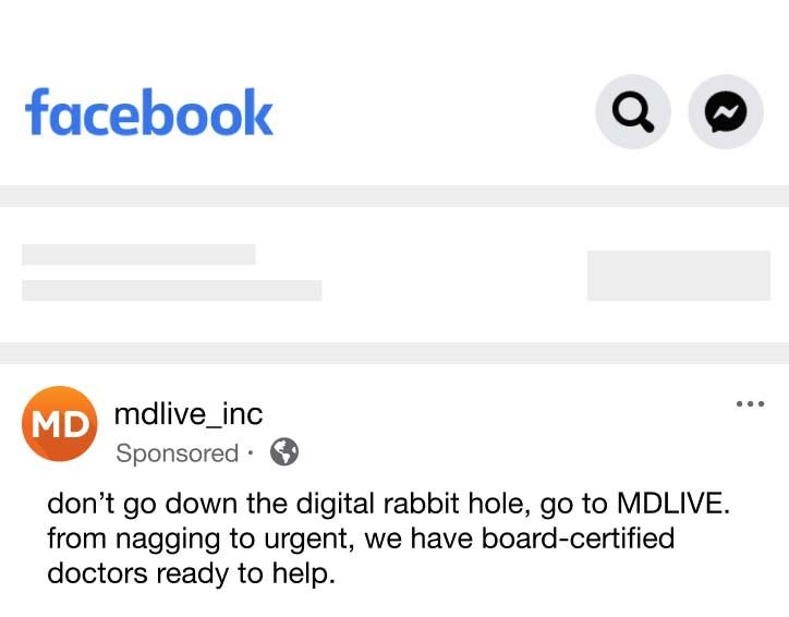 Asking the internet for medical advice usually leads to an inaccurate or wildly exaggerated diagnosis. Instead of finding answers, people find anxiety. There’s even a name for it: Cyberchondria. So to grow everyday visits we went after MD Live’s biggest competition – the digital rabbit hole – offering a more accurate, less stressful alternative.